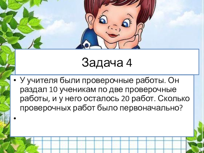 Задача 4У учителя были проверочные работы. Он раздал 10 ученикам по две проверочные работы, и у него