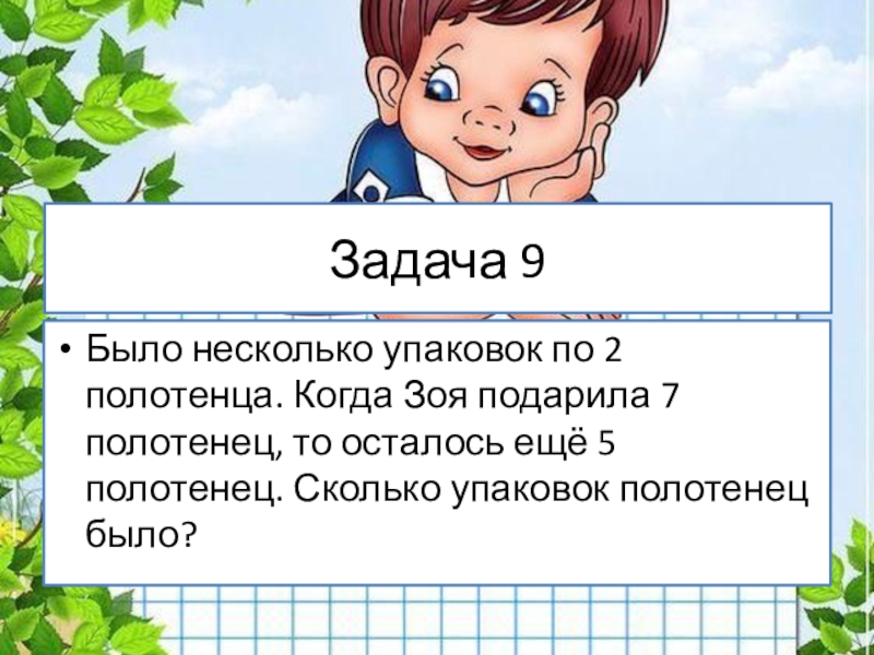 Задача 9Было несколько упаковок по 2 полотенца. Когда Зоя подарила 7 полотенец, то осталось ещё 5 полотенец.