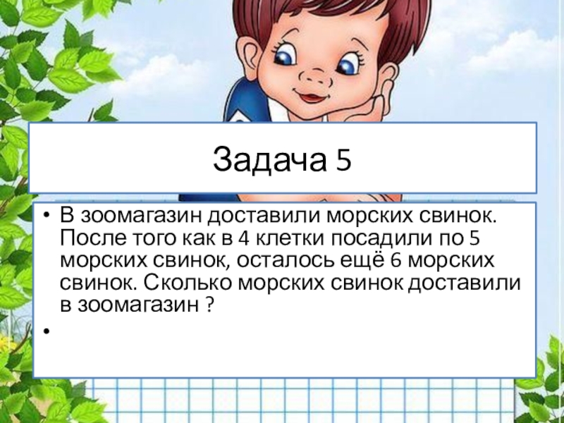Задача 5В зоомагазин доставили морских свинок. После того как в 4 клетки посадили по 5 морских свинок,
