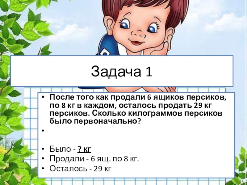 Задача 1После того как продали 6 ящиков персиков, по 8 кг в каждом, осталось продать 29 кг персиков. Сколько килограммов персиков было первоначально? Было - ? кгПродали - 6 ящ. по 8 кг.Осталось - 29 кг