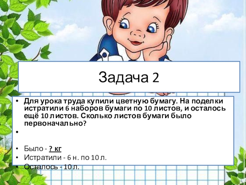 Задача 2Для урока труда купили цветную бумагу. На поделки истратили 6 наборов бумаги по 10 листов, и