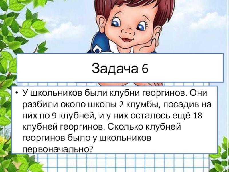 Задача 6У школьников были клубни георгинов. Они разбили около школы 2 клумбы, посадив на них по 9