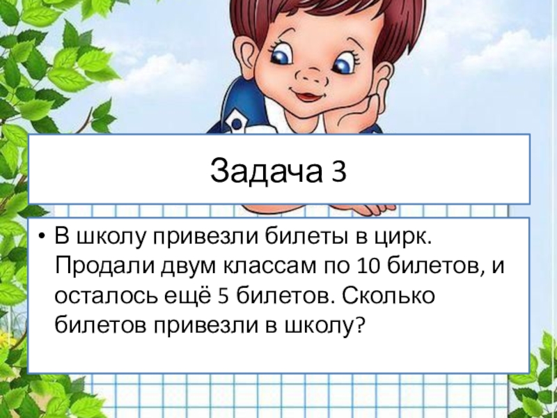 Задача 3В школу привезли билеты в цирк. Продали двум классам по 10 билетов, и осталось ещё 5