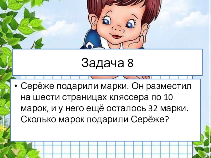Задача 8Серёже подарили марки. Он разместил на шести страницах кляссера по 10 марок, и у него ещё