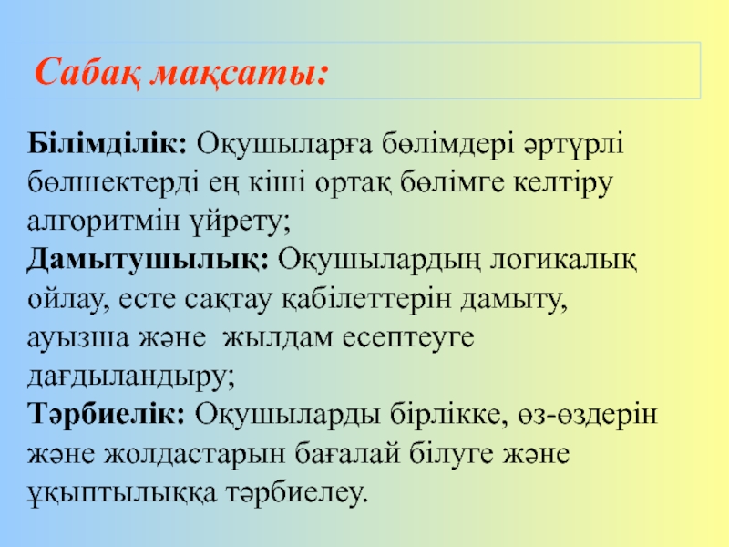 Сабақ мақсаты:Білімділік: Оқушыларға бөлімдері әртүрлі бөлшектерді ең кіші ортақ бөлімге келтіру алгоритмін үйрету;Дамытушылық: Оқушылардың логикалық ойлау, есте сақтау қабілеттерін дамыту, ауызша және жылдам есептеуге дағдыландыру; Тәрбиелік: Оқушыларды бірлікке, өз-өздерін және жолдастарын бағалай білуге және ұқыптылыққа