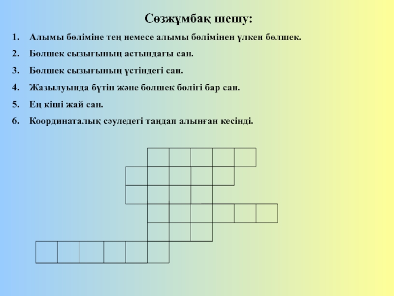 Сөзжұмбақ шешу:Алымы бөліміне тең немесе алымы бөлімінен үлкен бөлшек.Бөлшек сызығының астындағы сан.Бөлшек сызығының үстіндегі сан.Жазылуында бүтін және