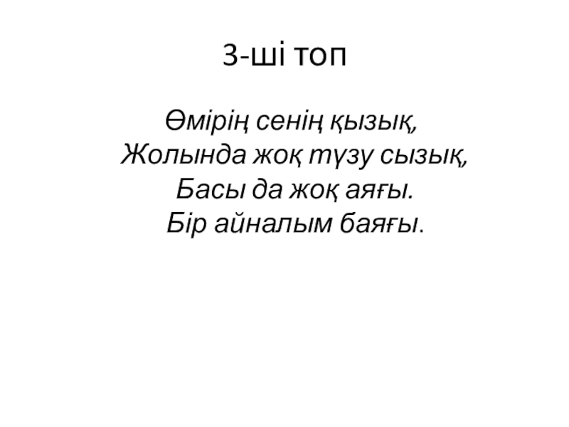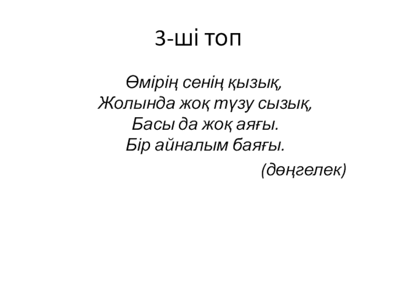 3-ші топ  Өмірің сенің қызық, Жолында жоқ түзу сызық, Басы да жоқ аяғы. Бір айналым баяғы.