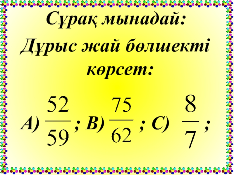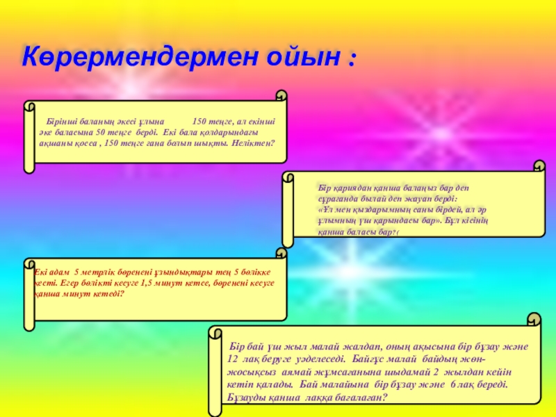 Бір бай үш жыл малай жалдап, оның ақысына бір бұзау және 12 лақ беруге уәделеседі. Байғұс малай байдың жөн-жосықсыз аямай жұмсағанына шыдамай 2 жылдан кейін кетіп қалады. Бай малайына бір бұзау және 6 лақ береді. Бұзауды қанша лаққа бағалаған?