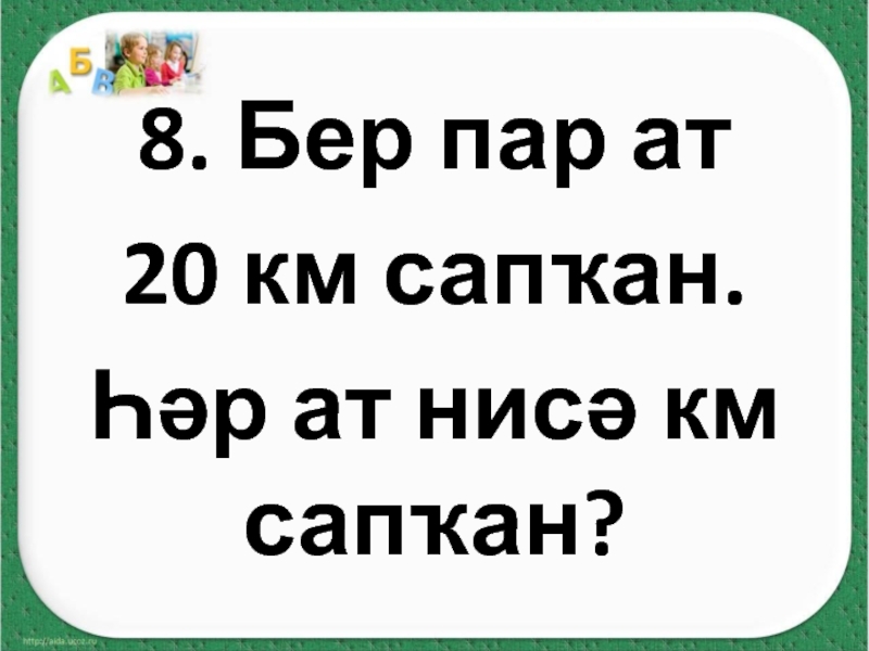 8. Бер пар ат 20 км сапҡан. Һәр ат нисә км сапҡан?