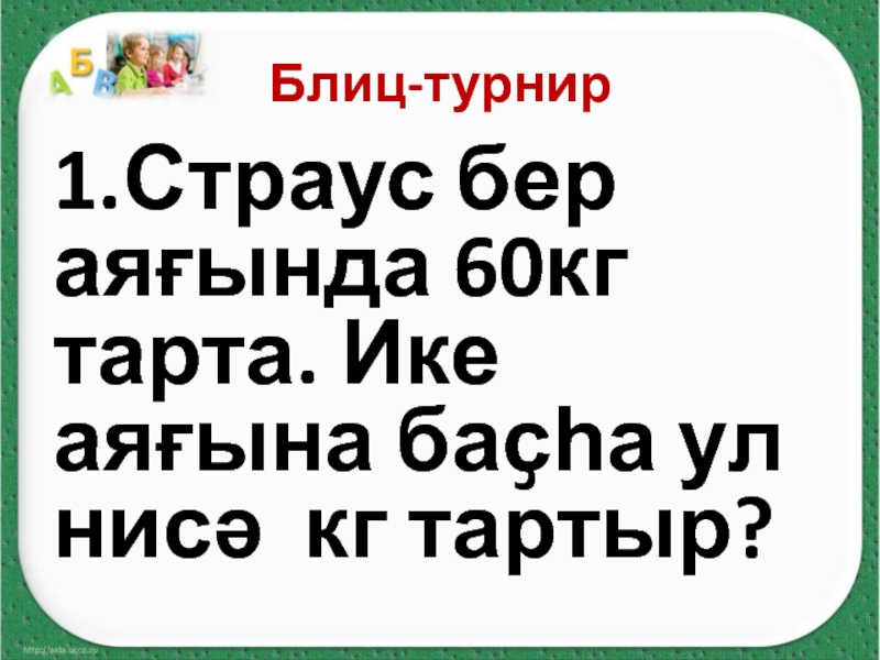 Блиц-турнир1.Страус бер аяғында 60кг тарта. Ике аяғына баҫһа ул нисә кг тартыр?