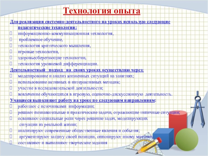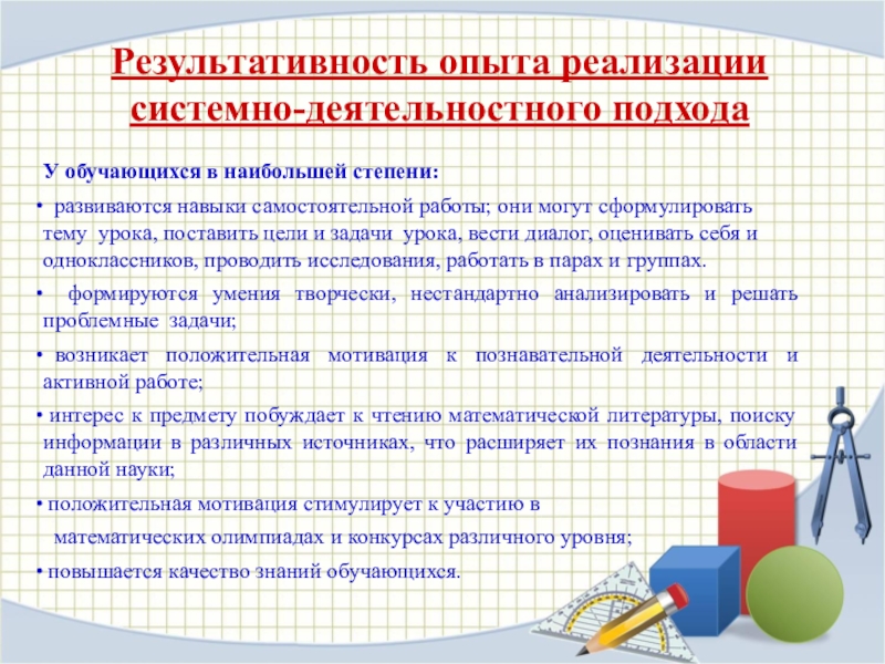 Основной целью своей работы считаю создание условий для развития творческой познавательной активности школьников через организацию совместной деятельности всех участников учебно-воспитательного процесса на основе системно-деятельностного подхода.