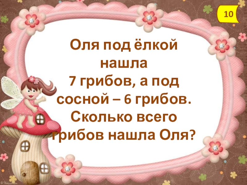 Оля под ёлкой нашла 7 грибов, а под сосной – 6 грибов. Сколько всего грибов нашла Оля?10
