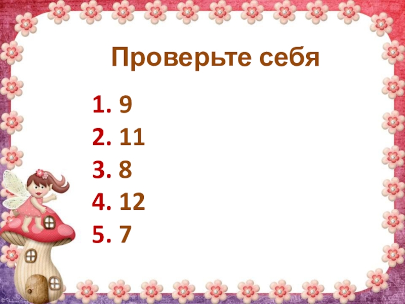 Проверьте себя1. 9 2. 11 3. 8 4. 12 5. 7   6. 9 7. 15