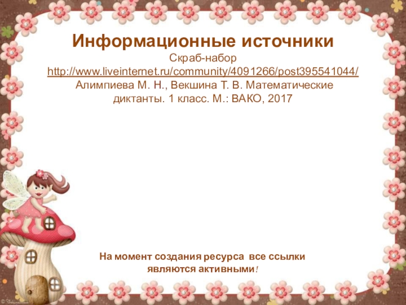 Информационные источникиСкраб-набор http://www.liveinternet.ru/community/4091266/post395541044/ Алимпиева М. Н., Векшина Т. В. Математические диктанты. 1 класс. М.: ВАКО, 2017На момент