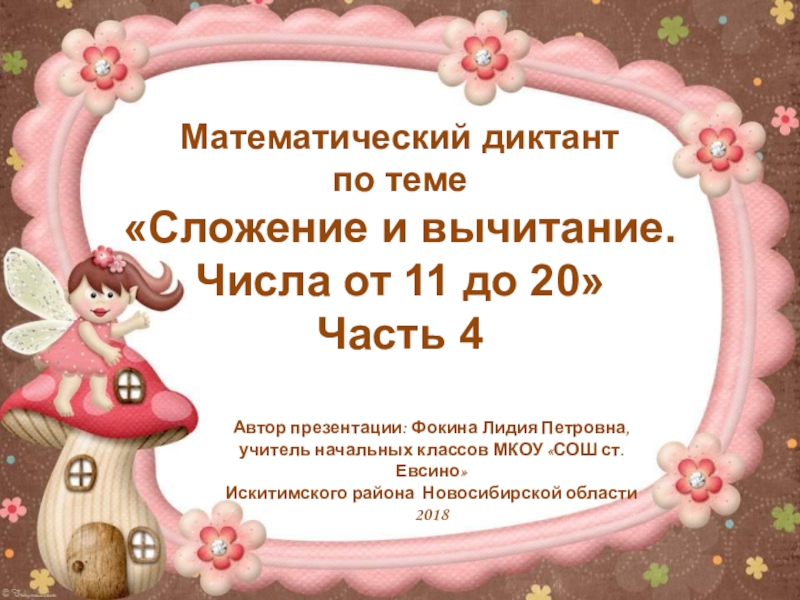 Математический диктант по теме«Сложение и вычитание.Числа от 11 до 20»Часть 4Автор презентации: Фокина Лидия Петровна, учитель начальных