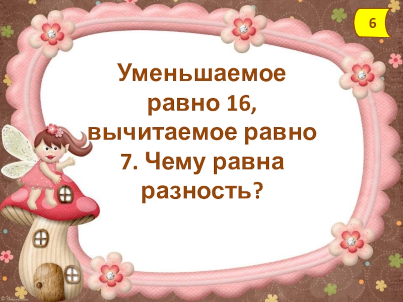 Уменьшаемое равно 16, вычитаемое равно 7. Чему равна разность?6