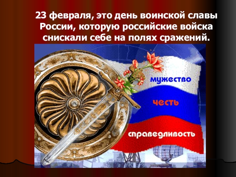 Слайд 423 февраля, это день воинской славы России, которую российские войска снискали