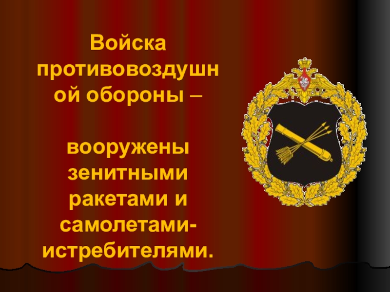 Войска противовоздушной обороны – вооружены зенитными ракетами и самолетами-истребителями.