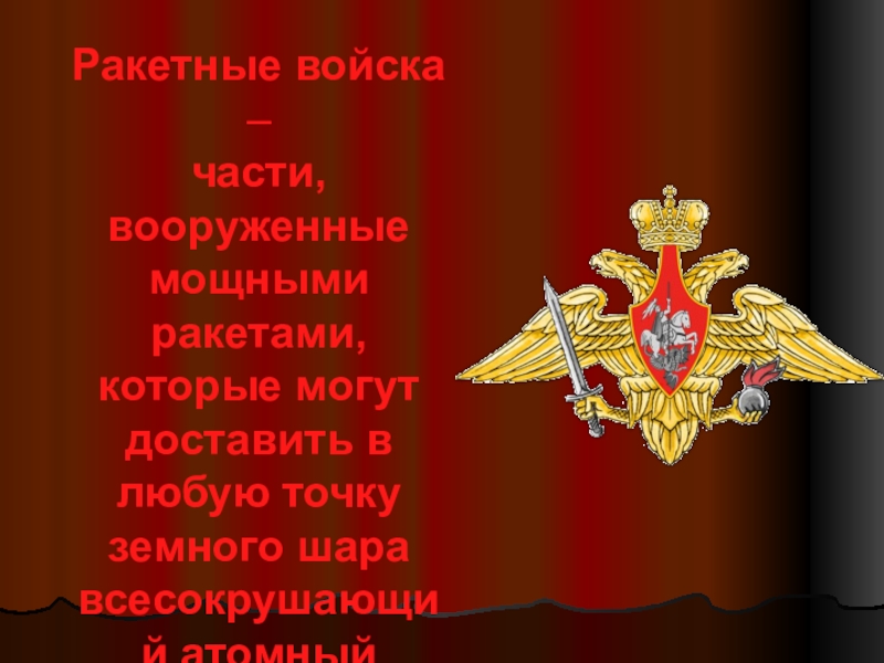 Ракетные войска – части, вооруженные мощными ракетами, которые могут доставить в любую точку земного шара всесокрушающий атомный