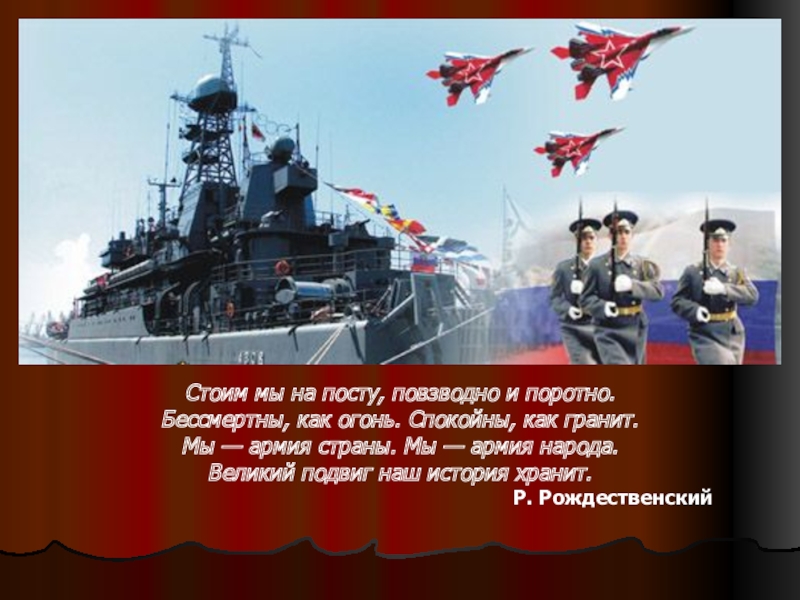 На страже Родины любимой  Родная Армия стоит  В бою за счастье человека  Она надежный