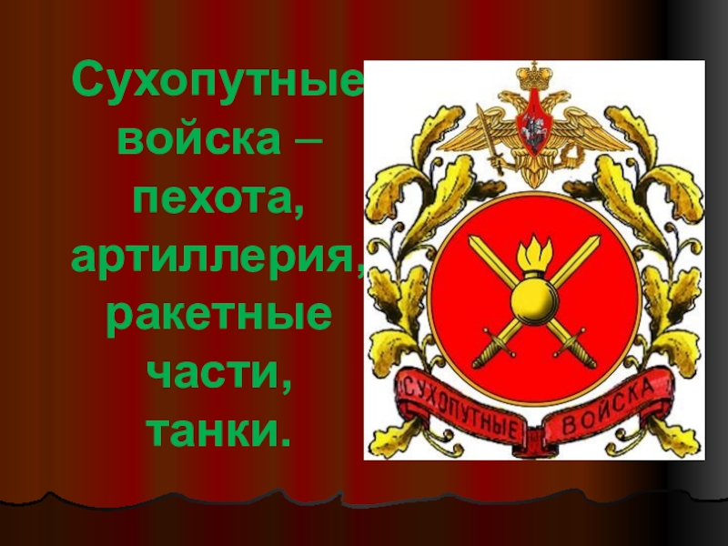Сухопутные войска – пехота, артиллерия, ракетные части, танки.