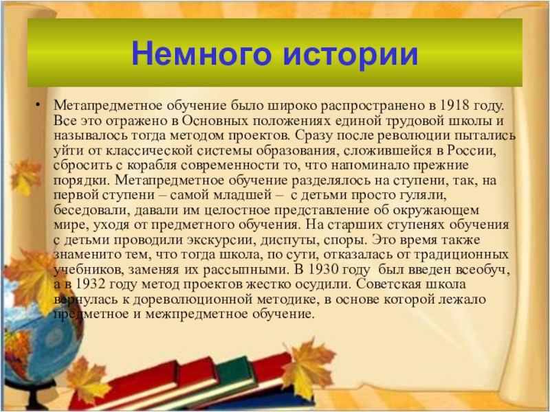 это отражено в Основных положениях единой трудовой школы и называлось тогда методом проектов. Сразу после революции пытались уйти от классической системы образования, сложившейся в России, сбросить с корабля современности то, что напоминало прежние порядки. Метапредметное обучение разделялось на ступени, так, на первой ступени – самой младшей – с детьми просто гуляли, беседовали, давали им целостное представление об окружающем мире, уходя от предметного обучения. На старших ступенях обучения с детьми проводили экскурсии, диспуты, споры. Это время также знаменито тем, что тогда школа, по сути, отказалась от традиционных учебников, заменяя их рассыпными. В 1930 году был введен всеобуч, а в 1932 году метод проектов жестко осудили. Советская школа вернулась к дореволюционной методике, в основе которой лежало предметное и межпредметное обучение.
