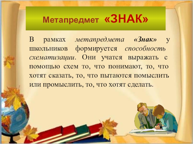 В рамках метапредмета «Знак» у школьников формируется способность схематизации. Они