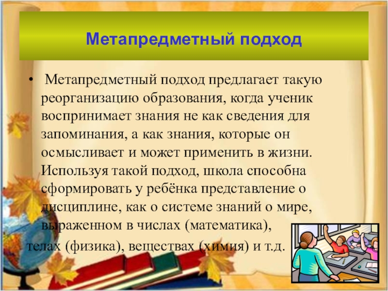 Метапредметный подход предлагает такую реорганизацию образования, когда ученик