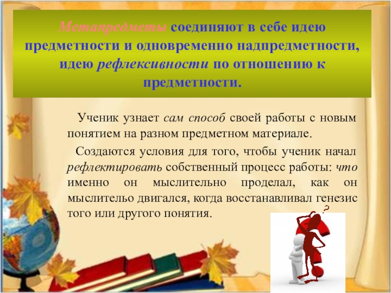 Создаются условия для того, чтобы ученик начал рефлектировать собственный процесс работы: что именно он мыслительно проделал, как он мыслительо двигался, когда восстанавливал генезис того или другого понятия.