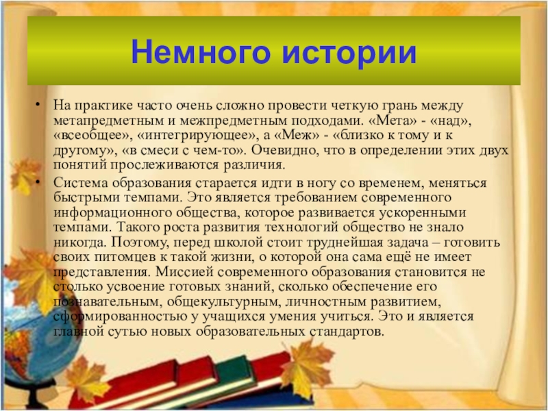 метапредметным и межпредметным подходами. «Мета» - «над», «всеобщее», «интегрирующее», а «Меж» - «близко к тому и к другому», «в смеси с чем-то». Очевидно, что в определении этих двух понятий прослеживаются различия.