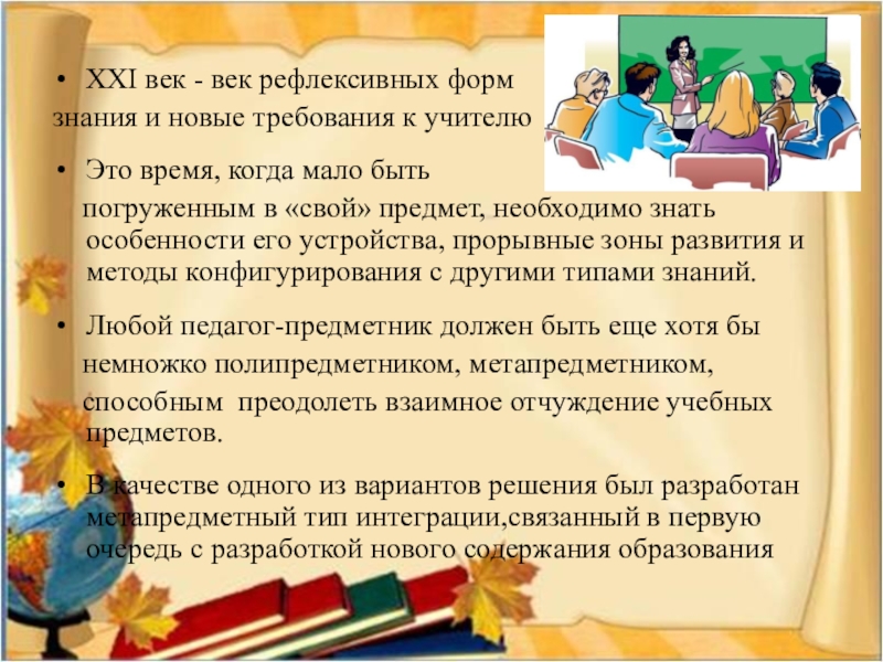 погруженным в «свой» предмет, необходимо знать особенности его устройства, прорывные зоны развития и методы конфигурирования с другими типами знаний.