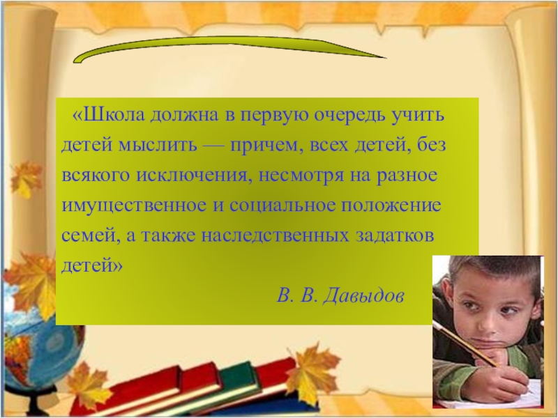 воспринимает знания не как сведения для запоминания, а как знания, которые он осмысливает и может применить в жизни. Используя такой подход, школа способна сформировать у ребёнка представление о дисциплине, как о системе знаний о мире, выраженном в числах (математика),