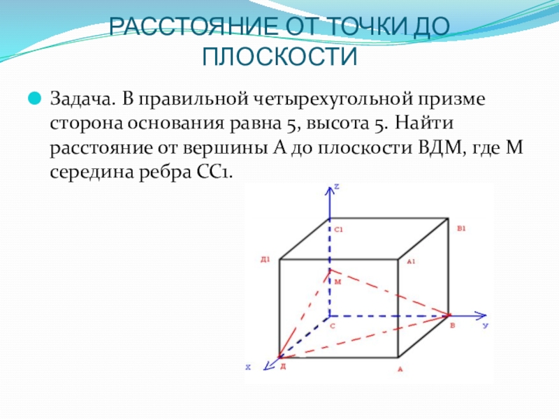 равна 5, высота 5. Найти расстояние от вершины A до плоскости BДM, где M середина ребра CC1.