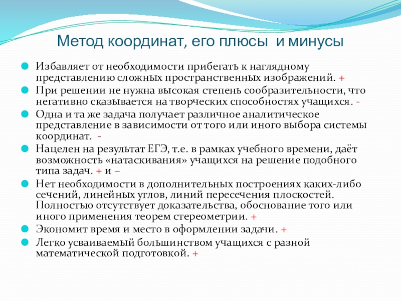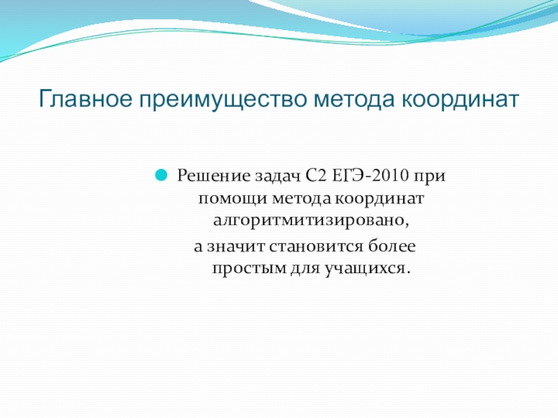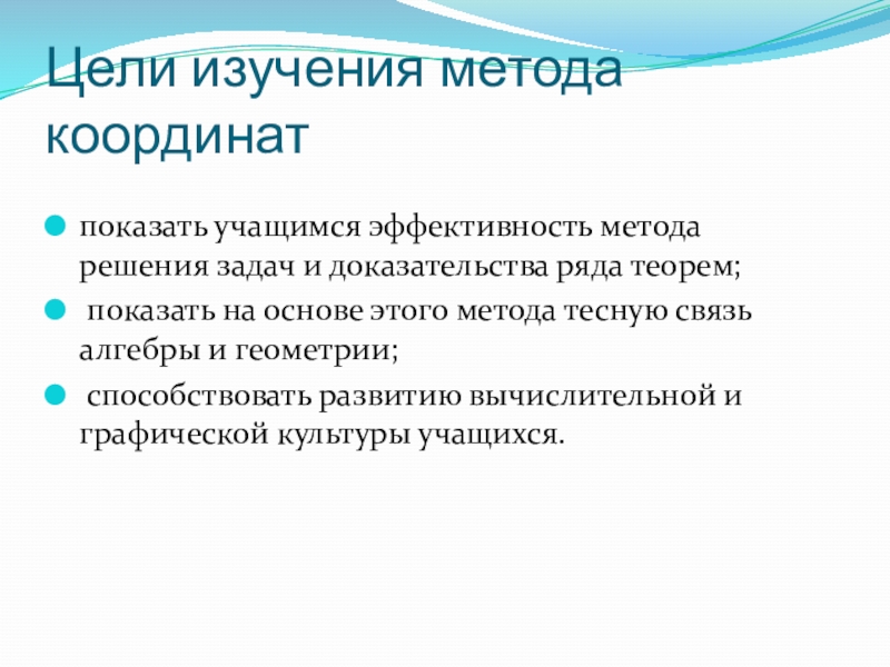 В некоторых случаях метод координат дает возможность строить доказательства и решать многие задачи более рационально, красиво, чем чисто геометрическими способами.
