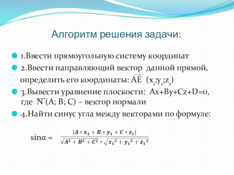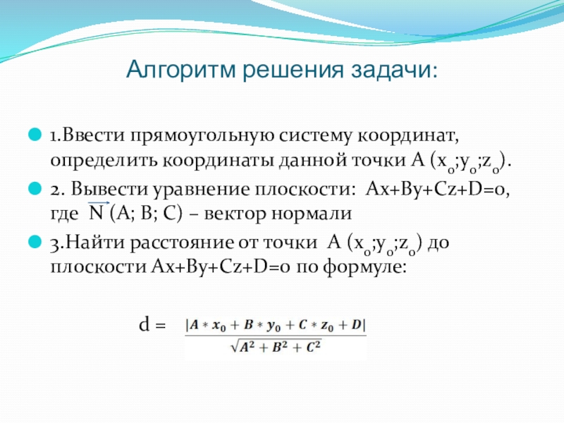 3.Найти расстояние от точки A (х0;у0;z0) до плоскости Ах+Ву+Сz+D=0 по формуле: