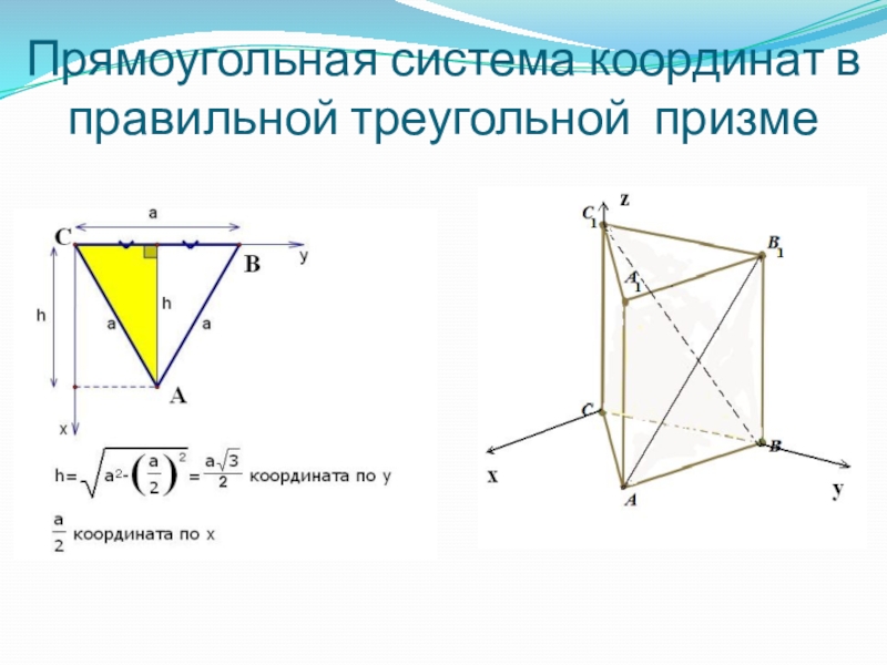Слайд 19Прямоугольная система координат в правильной треугольной призме