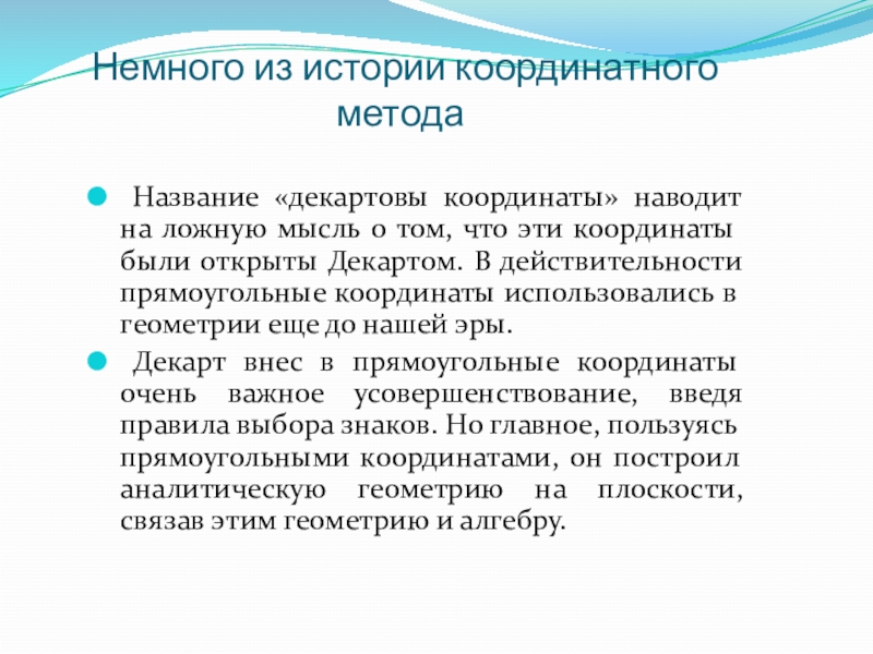 Декарт внес в прямоугольные координаты очень важное усовершенствование, введя правила выбора знаков. Но главное, пользуясь прямоугольными координатами, он построил аналитическую геометрию на плоскости, связав этим геометрию и алгебру.