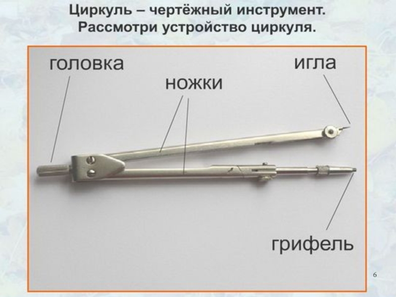 Циркуль – это чертежный инструмент. С ним нужно работать осторожно. На одном конце у него — игла, на другом — карандаш. Пользоваться им надо осторожно, чтобы не уколоться и не поломать грифель карандаша. Нельзя подносить циркуль иглой к лицу и нельзя передавать циркуль соседу “иглой вперед”.