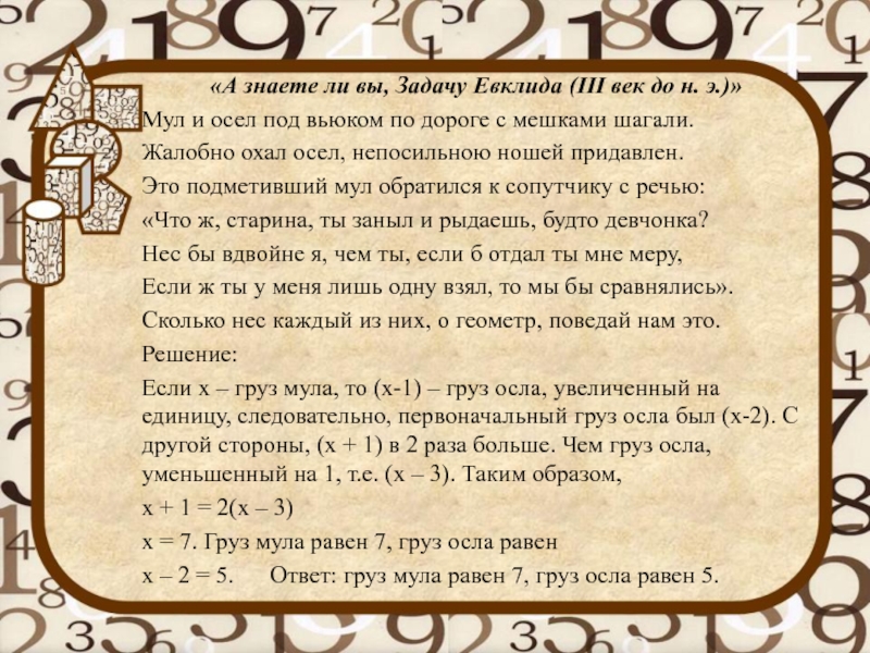 Если х – груз мула, то (х-1) – груз осла, увеличенный на единицу, следовательно, первоначальный груз осла был (х-2). С другой стороны, (х + 1) в 2 раза больше. Чем груз осла, уменьшенный на 1, т.е. (х – 3). Таким образом,