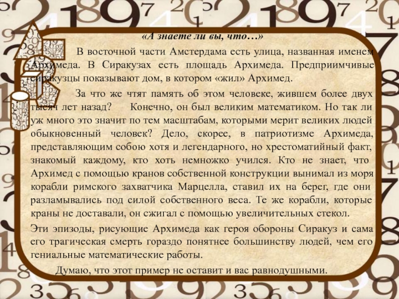 Эти эпизоды, рисующие Архимеда как героя обороны Сиракуз и сама его трагическая смерть гораздо понятнее большинству людей, чем его гениальные математические работы.