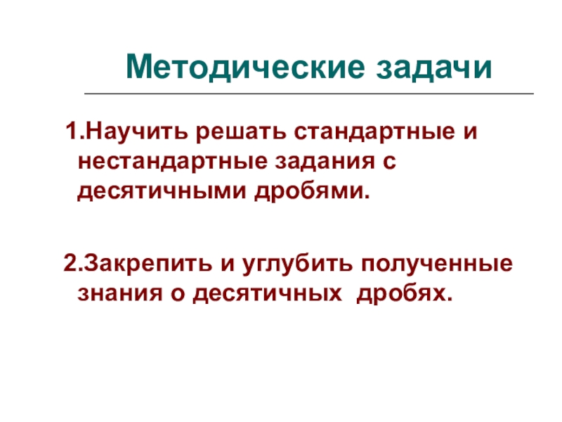 1.Научить решать стандартные и нестандартные задания с десятичными дробями.