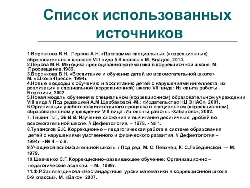 2.Перова М.Н. Методика преподавания математики в коррекционной школе. М.