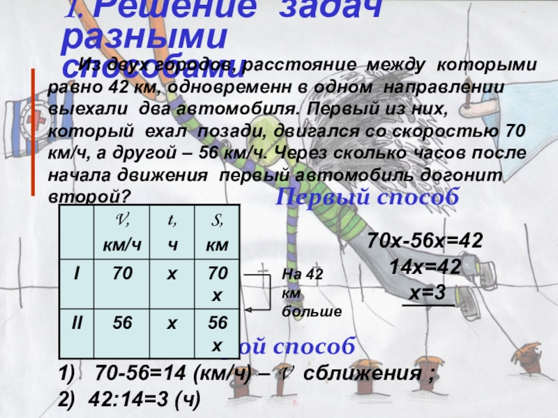 1) 70-56=14 (км/ч) – V сближения ;