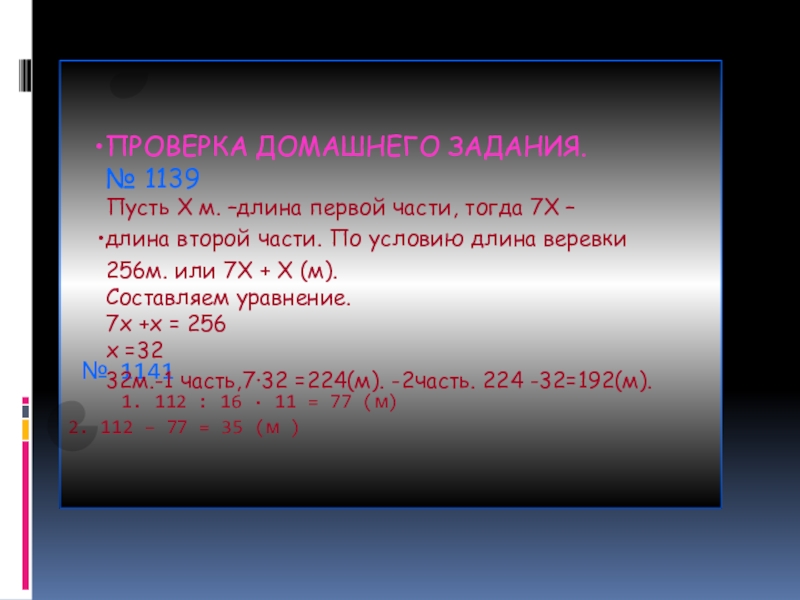 32м.-1 часть,7∙32 =224(м). -2часть. 224 -32=192(м).