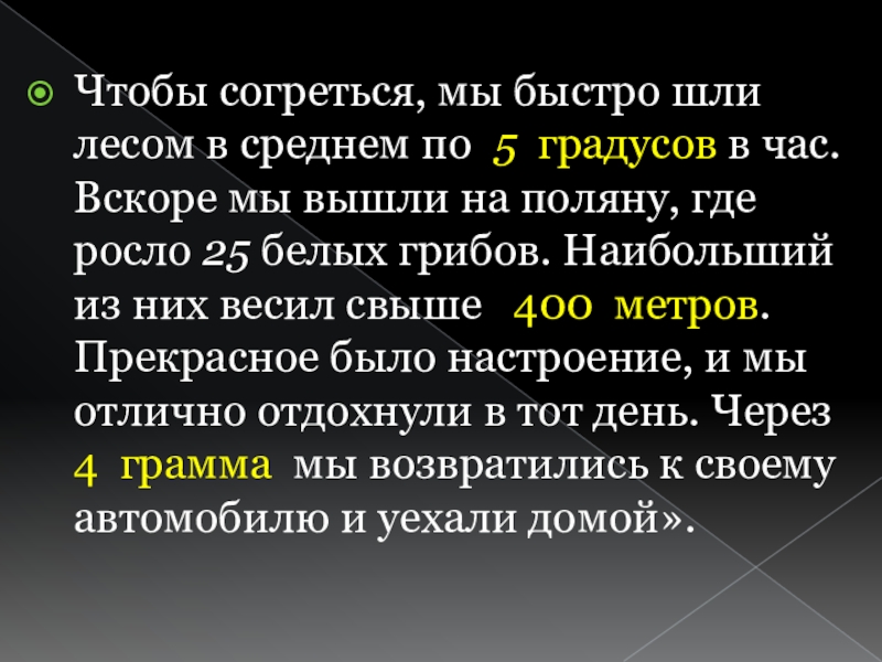 в час. Вскоре мы вышли на поляну, где росло 25 белых грибов. Наибольший из них весил свыше 400 метров. Прекрасное было настроение, и мы отлично отдохнули в тот день. Через 4 грамма мы возвратились к своему автомобилю и уехали домой».