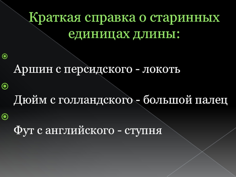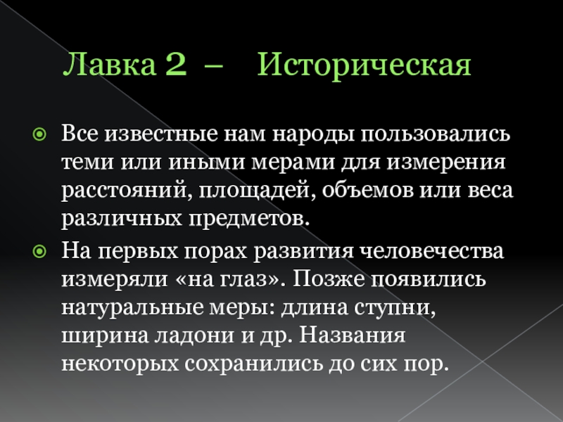 На первых порах развития человечества измеряли «на глаз». Позже появились натуральные меры: длина ступни, ширина ладони и др. Названия некоторых сохранились до сих пор.