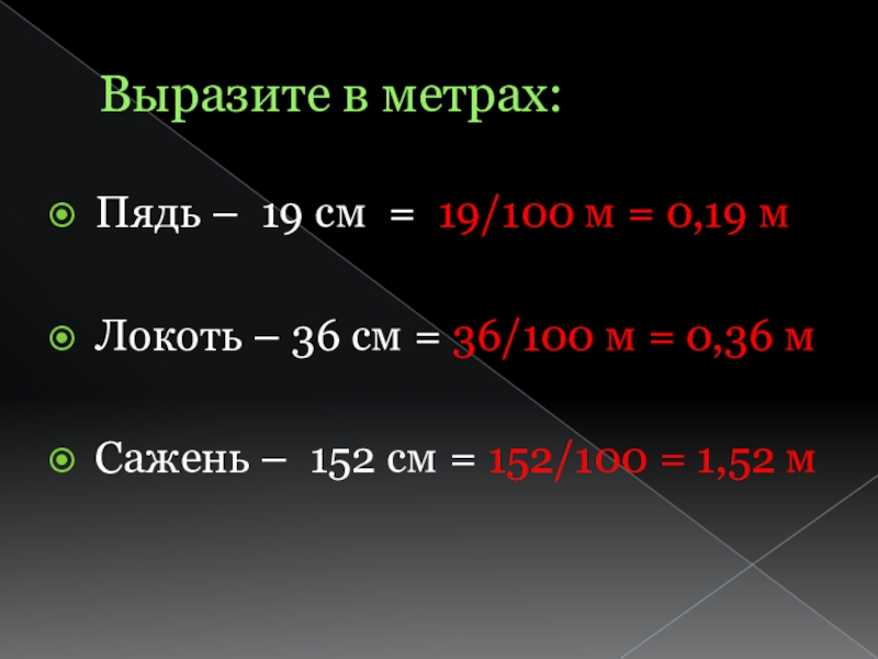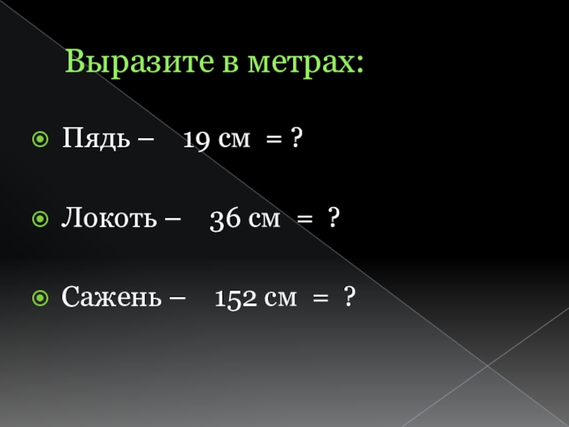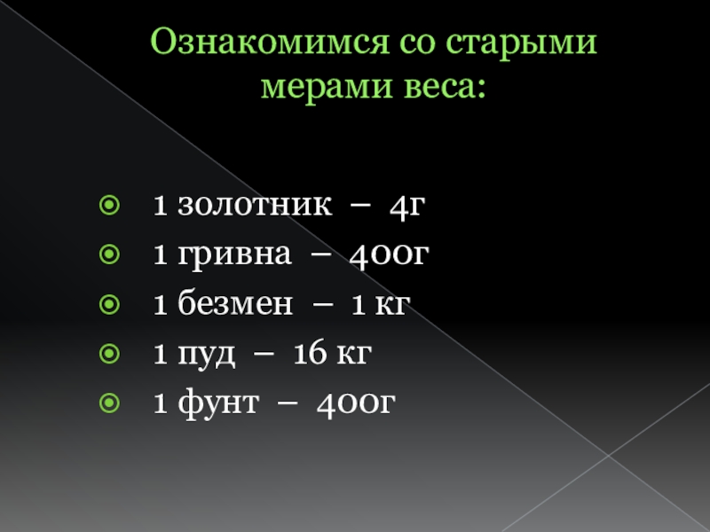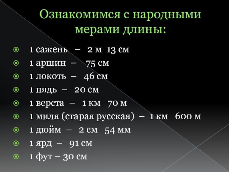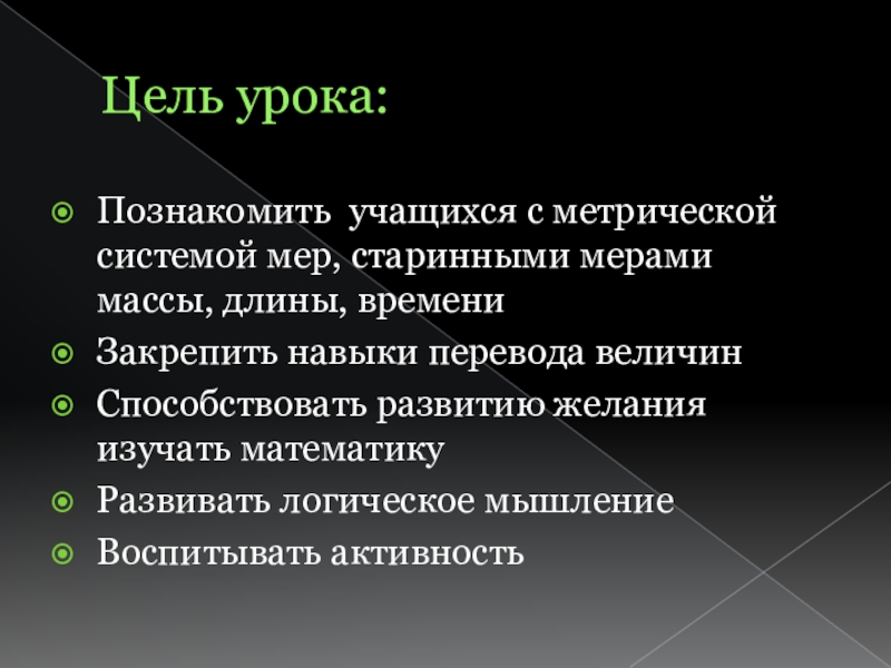 Познакомить учащихся с метрической системой мер, старинными мерами массы, длины,