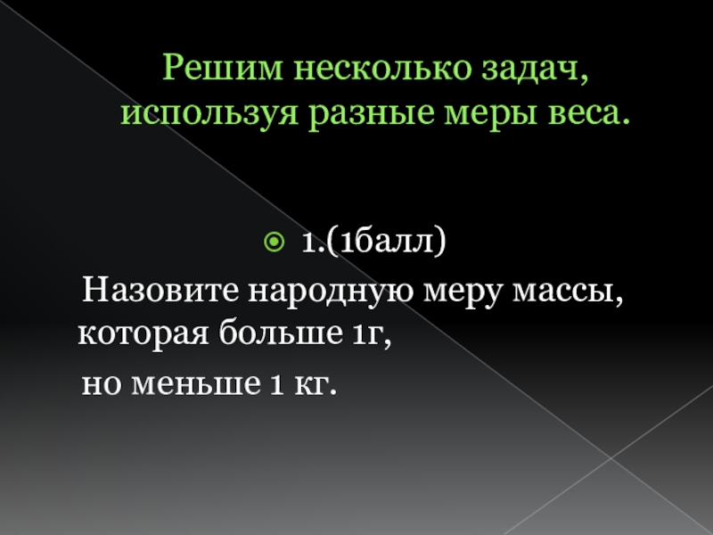 Слайд 47Решим несколько задач, используя разные меры веса.