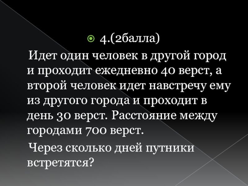 ежедневно 40 верст, а второй человек идет навстречу ему из другого города и проходит в день 30 верст. Расстояние между городами 700 верст.