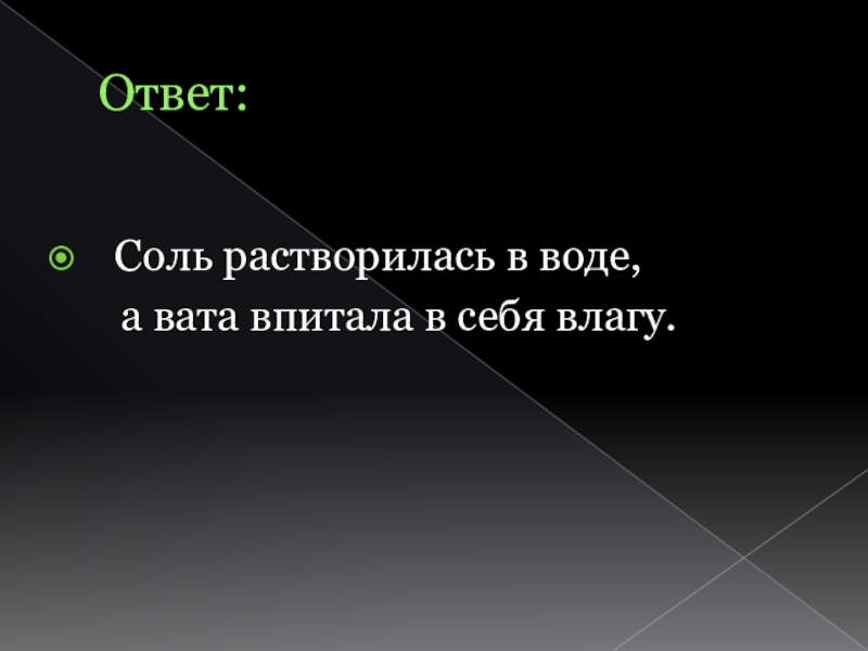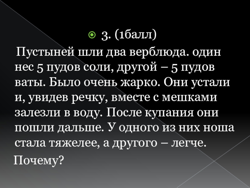 пудов соли, другой – 5 пудов ваты. Было очень жарко. Они устали и, увидев речку, вместе с мешками залезли в воду. После купания они пошли дальше. У одного из них ноша стала тяжелее, а другого – легче.